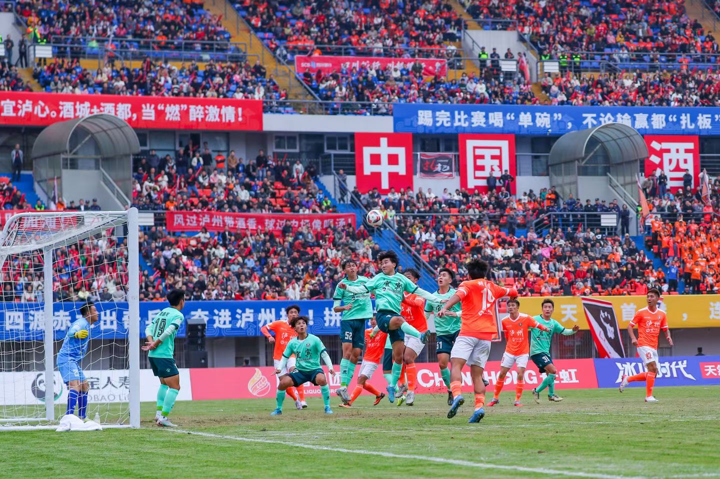 看台上,泸州队球迷们拉起了巨型“拼了”横幅,而泸州队员的表现正如球迷所期待,全场踢得格外努力,持续发动猛烈进攻。比赛第62分钟,泸州队49号王梓谦一记进球打破僵局,将比分改写为1:0,瞬间点燃全场球迷的热情。