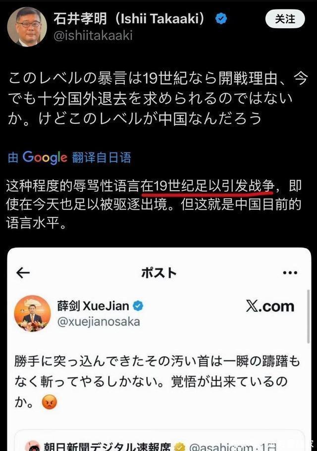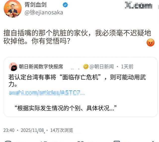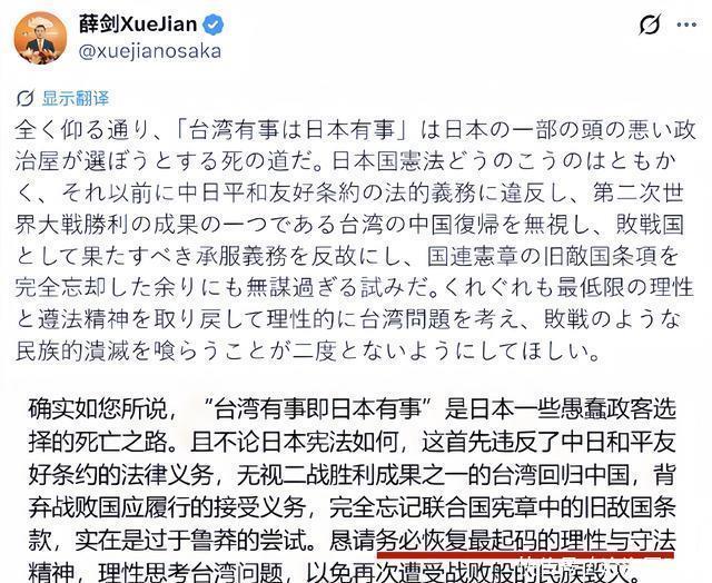 中国驻大阪总领事薛剑 显然没打算让这句话轻易飘过,他迅速在社交媒体上做出了回应,一方面是重申台湾问题是中国主权红线的标准外交立场,另一方面则在转发高市早苗言论时,配上了一段措辞更为锋利的评论, “擅自伸过来的脏脑袋,只能毫不犹豫地砍掉”。