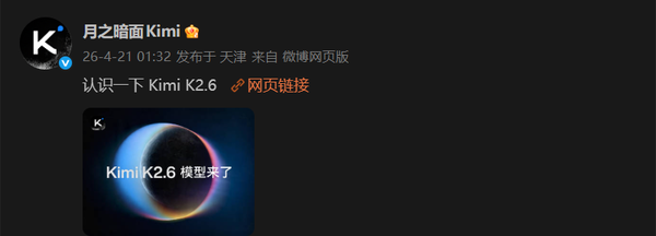 【CNMO科技消息】近日,月之暗面Kimi正式发布并开源Kimi K2.6模型,全面精进代码、长程任务执行和Agent集群能力。Kimi K2.6现已上线kimi.com、最新版Kimi应用、Kimi API和Kimi Code编程助手,所有用户均可使用。