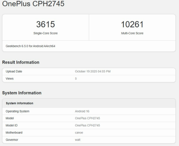 Geekbench数据库显示,一加15全球版搭载高通骁龙8EliteGen5移动平台,单核跑分达3615分,多核成绩为10261分。尽管页面未直接标注芯片型号,但通过源代码中的CPU与GPU信息可确认其配备的是高通当前最强的移动平台。该机型配备12GB运行内存,运行基于Android16深度定制的OxygenOS16操作系统,而中国市场版本则将搭载ColorOS16。